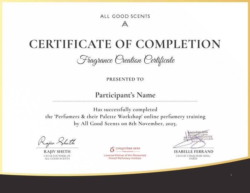 This course is an official Cinquième Sens Paris program — a globally respected institution in fragrance education since 1976, headquartered in the heart of Paris.